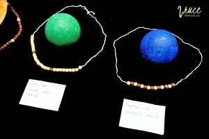 - Jupiter a Saturn – největší výzva. Dětem jsem totiž určila, že každý desátý korálek má být jiný (světlý), aby se pak snáze zorientovaly v tom, která šňůrka s korálky patří ke které planetě (79 a 82 vedle sebe opravdu vypadá skoro stejně).