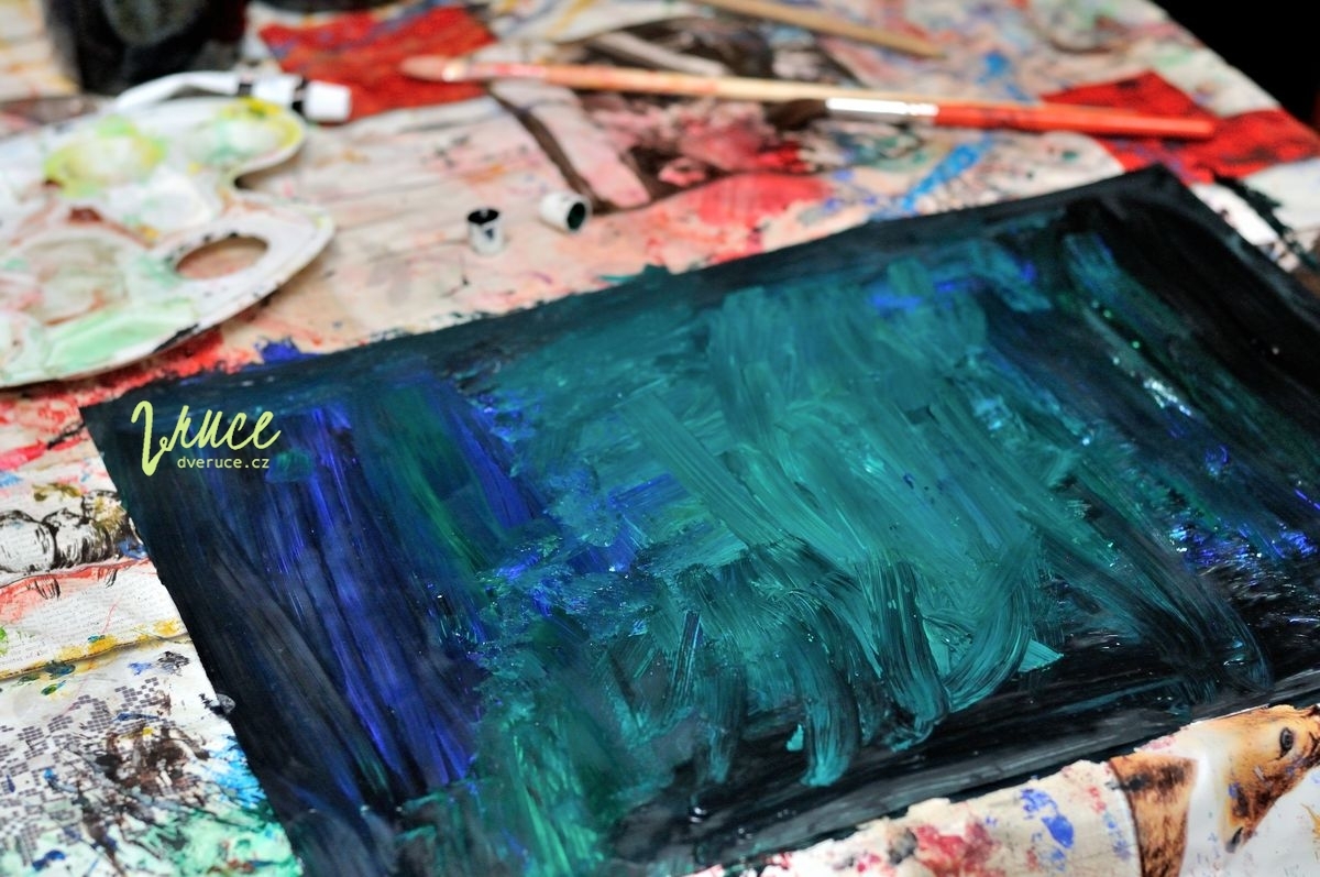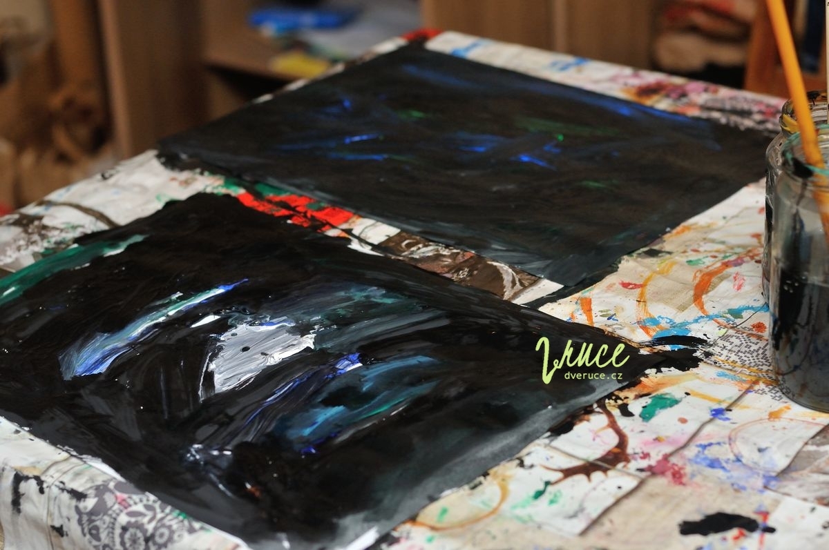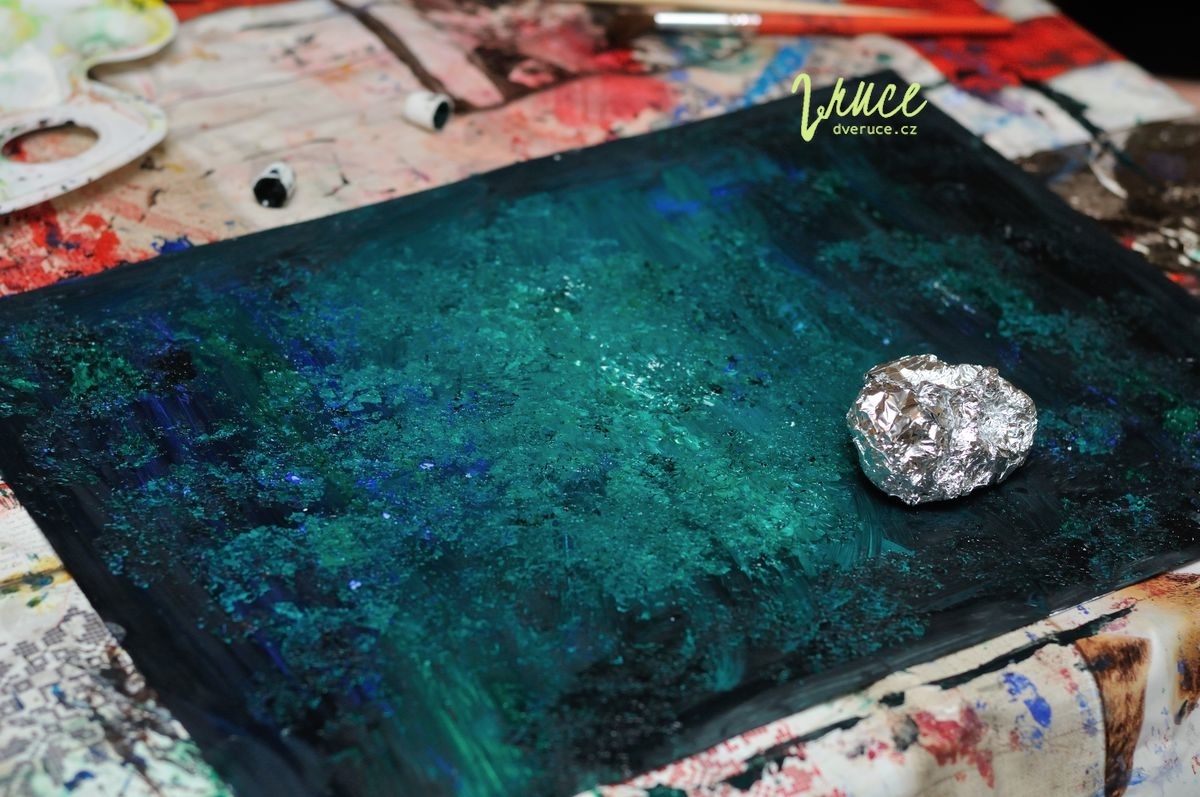 My jsme zvolili tmavé odstíny pro noční pozadí, ale můžete to samozřejmě pojmout po svém. - Barvu rozetřete po celé ploše papíru. Klidně ledabyle, zbytek dodělá alobal.