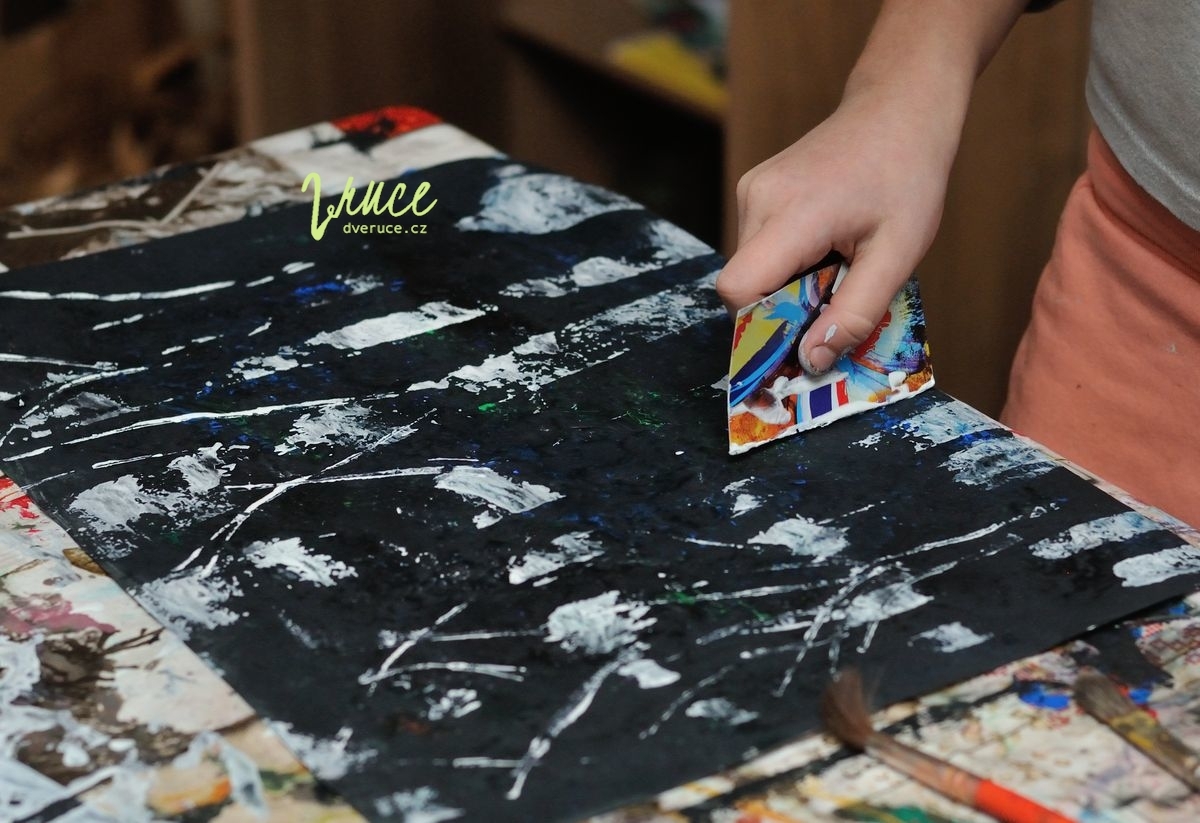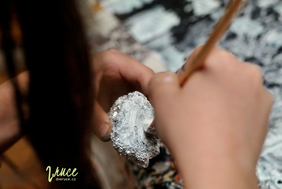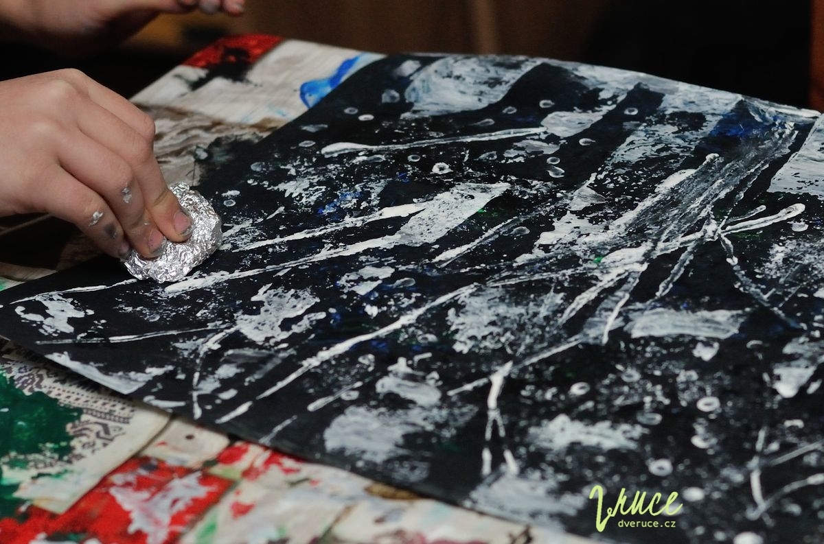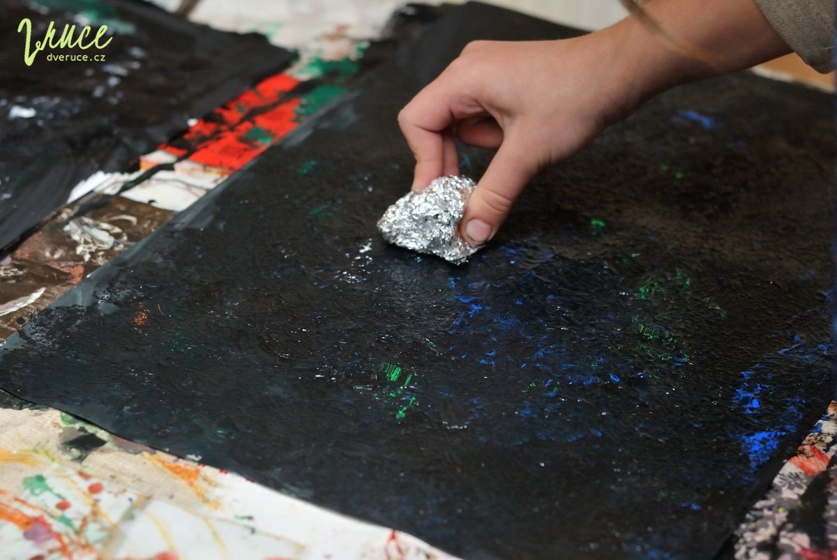 Barva ovšem musí být ve velké vrstvě, raději to znovu opakuji, s dětmi to přece jenom trvá, takže té barvy bude potřeba o to více. - Zmuchlejte kus alobalu do kuličky a obtiskávejte ji do barvy. Ihned uvidíte, jak se vám pozadí mění před očima.