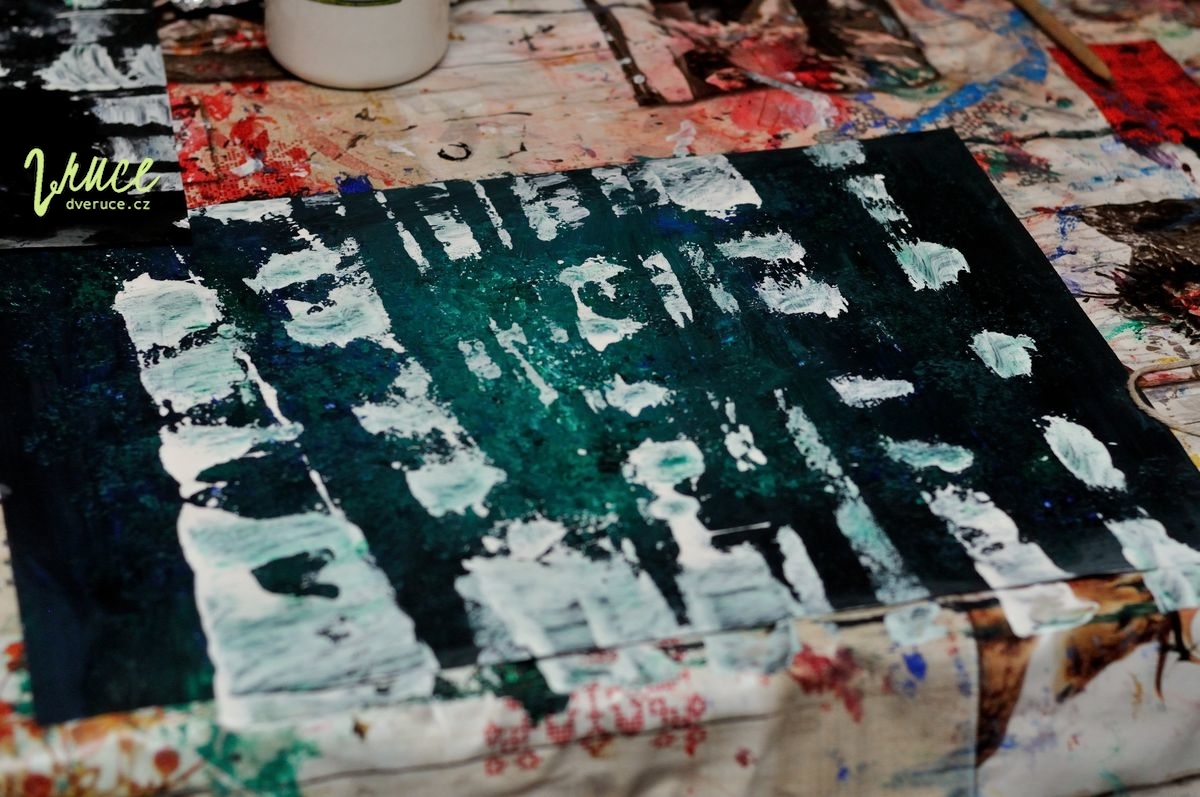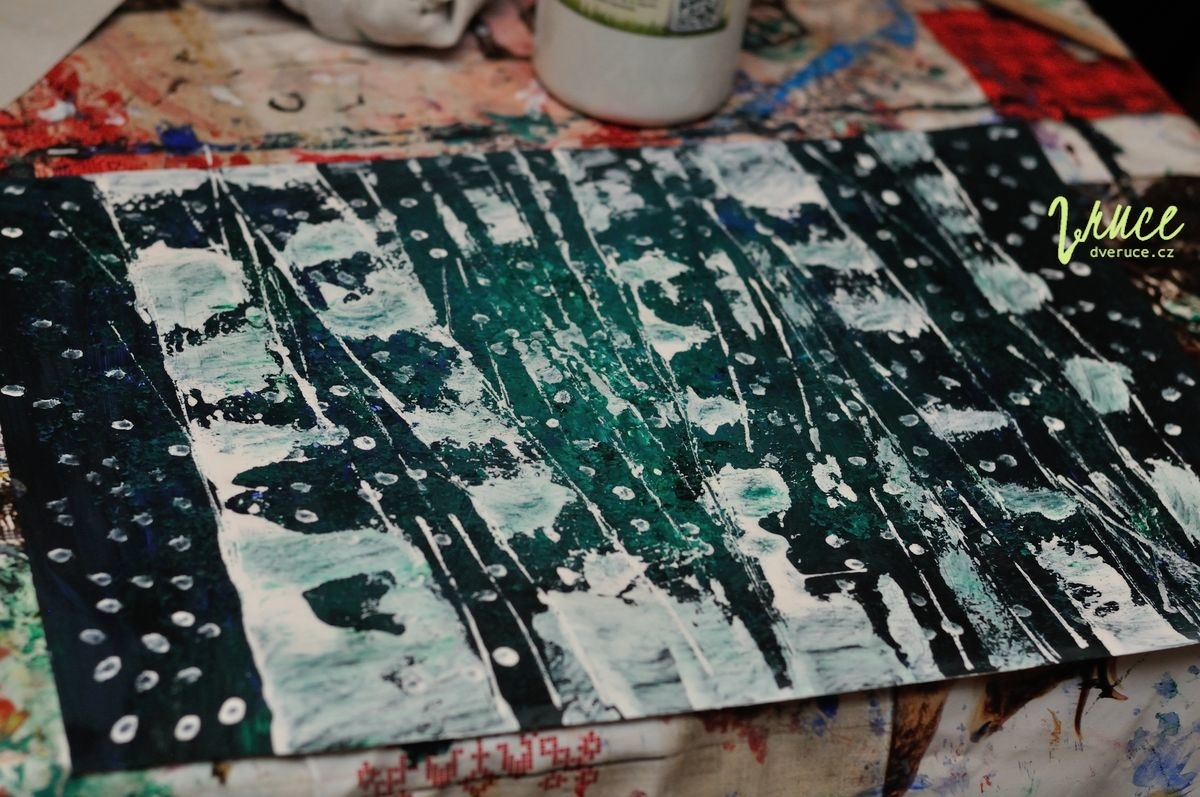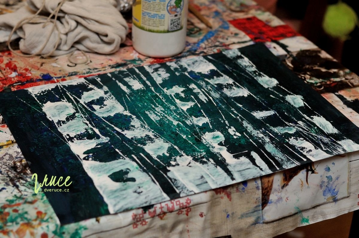 Složitější a neokoukané postupy fascinují děti a mnohdy i dospělé. U tohoto obrázku jsme si vyzkoušeli všechno možné a děti litovaly, že už to mají hotové, nejraději by hned vytvořili další les.