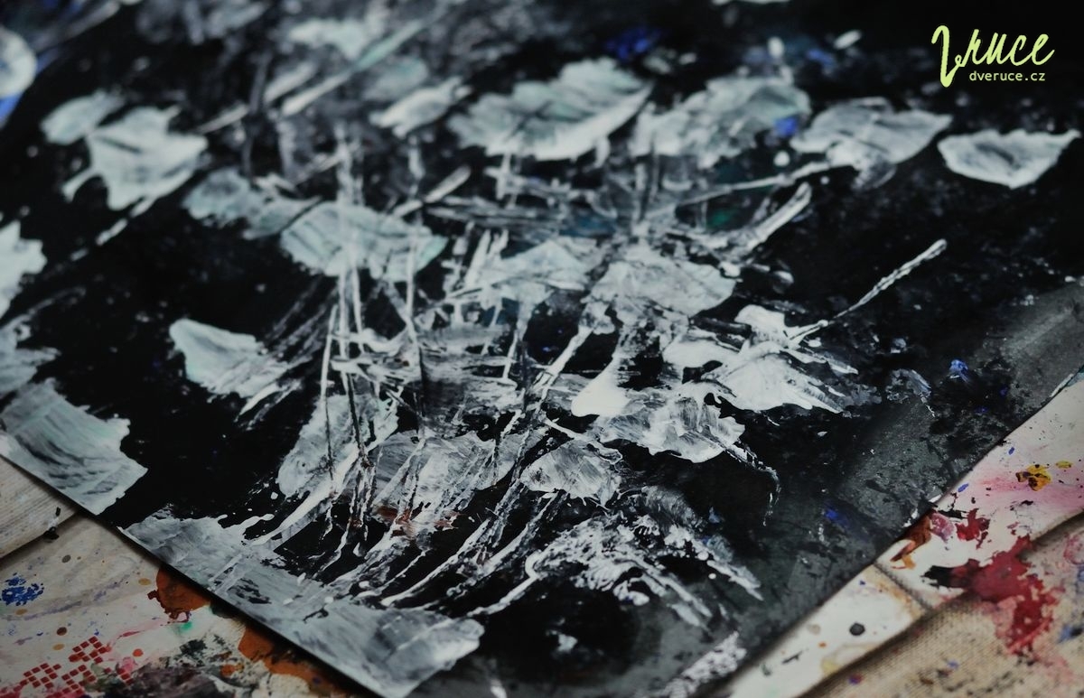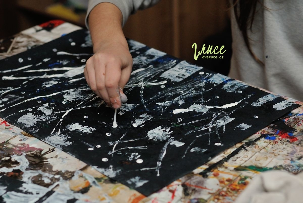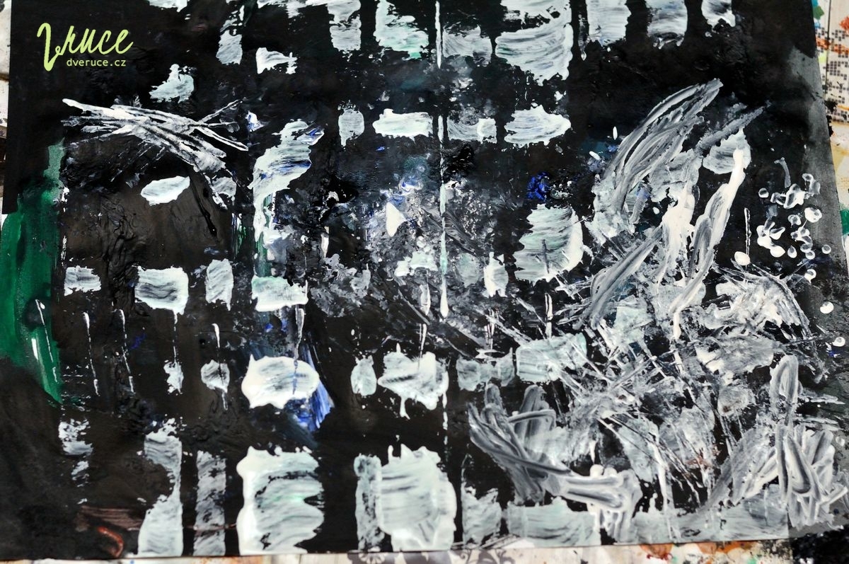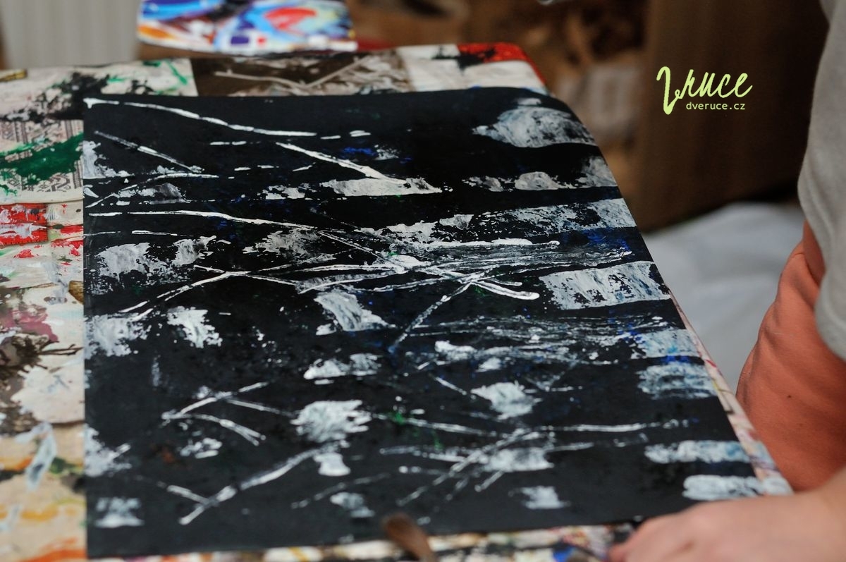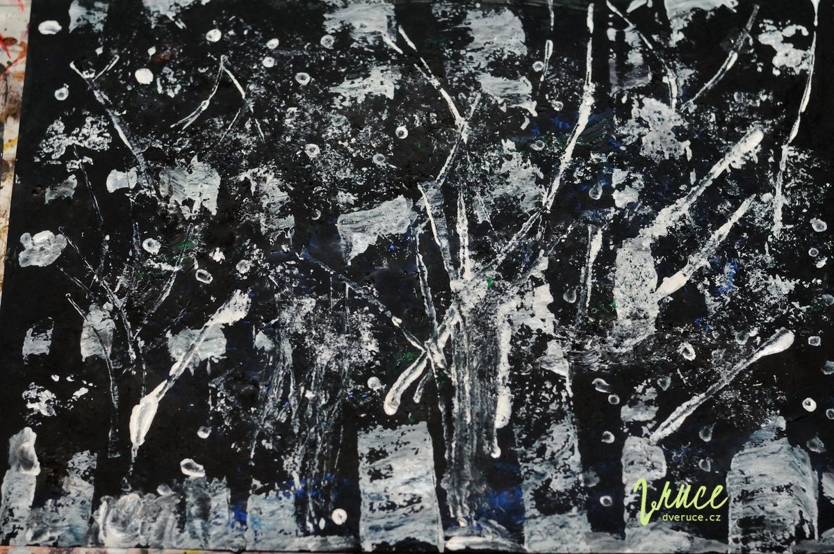 - Pomocí tyčinky namočené do bílé barvy vytvořte velké těžké vločky sněhu. Čím méně, tím lépe, jinak se začne původní představa rychle ztrácet.